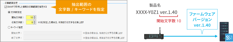 収集したMIB情報をSS1機器情報内のどの項目に反映させるかについて、機器ごとに選択できます。 収集する文字列の開始位置/終了位置を指定し、任意の文字列のみ抽出することも可能です。 製品名にファームウェアバージョンなどが含まれている場合にご活用いただけます。